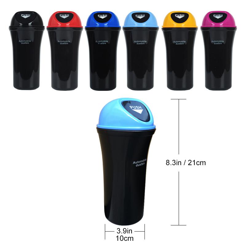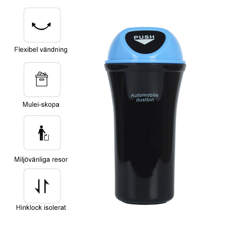 "Kompakt papperskorg för bil, diskret design med skjutlock, hållbart ABS-material, tillgänglig i flera färger."