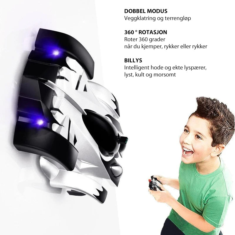Upptäck en helt ny nivå av lek med vår radiostyrda anti-gravity bil, som kan köra på väggar och tak! Detta fantastiska fordon är den perfekta gåvan för barn som älskar actionfyllda äventyr. Med sina starka LED-strålkastare och futuristiska design kommer denna bil att ge timmar av underhållning.