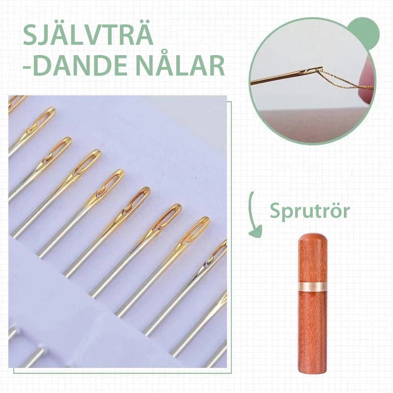 "Självgängande synålar i guld och silver, perfekta för sömnad på läder och siden, set med 12 st varierande storlekar."