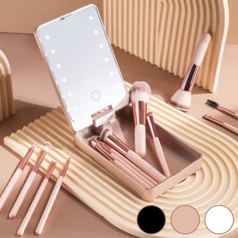Upplev perfektion var som helst och när som helst! Våra sminkborstar för resor kommer med en praktisk LED-spegel som säkerställer att du alltid har den perfekta belysningen för sminkapplikation. Perfekt för den moderna kvinnan på språng.