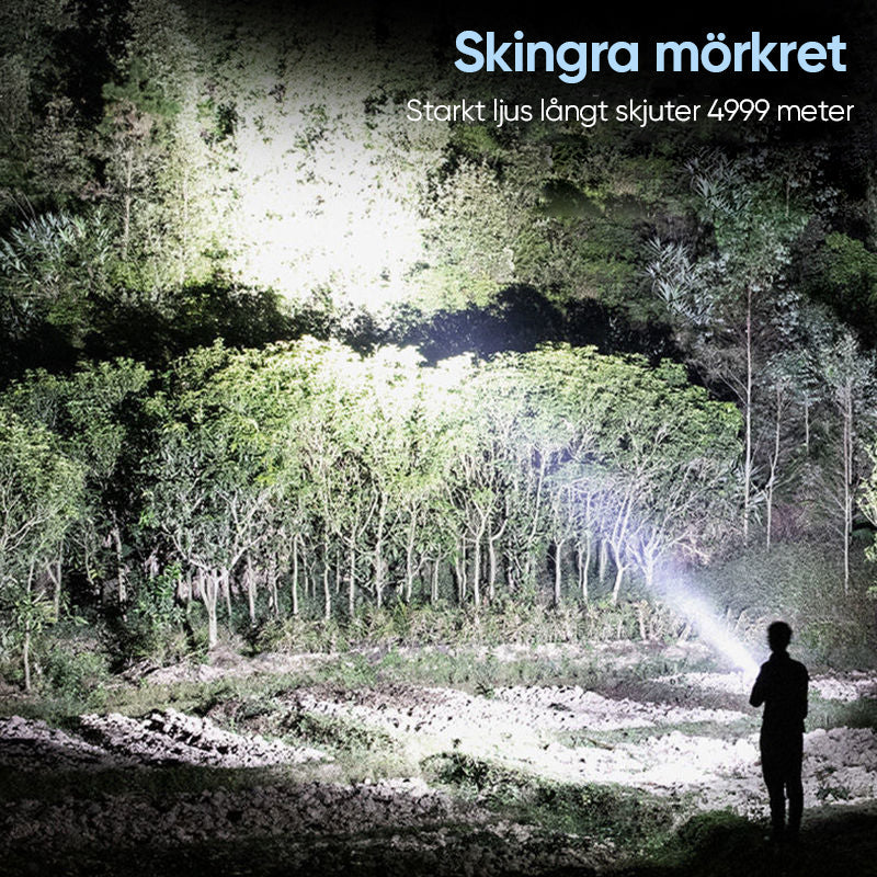 • Superljus LED: Bred ljusstråle som kan lysa upp till 4999 fot, idealisk för att lysa upp ett helt rum eller utomhusområde.