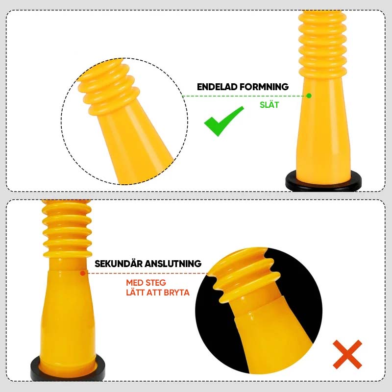 "Flexibel bensindunkpip i böjbart PP-material med gängade piprör, förenklar säker och spillsäker bränsleöverföring."