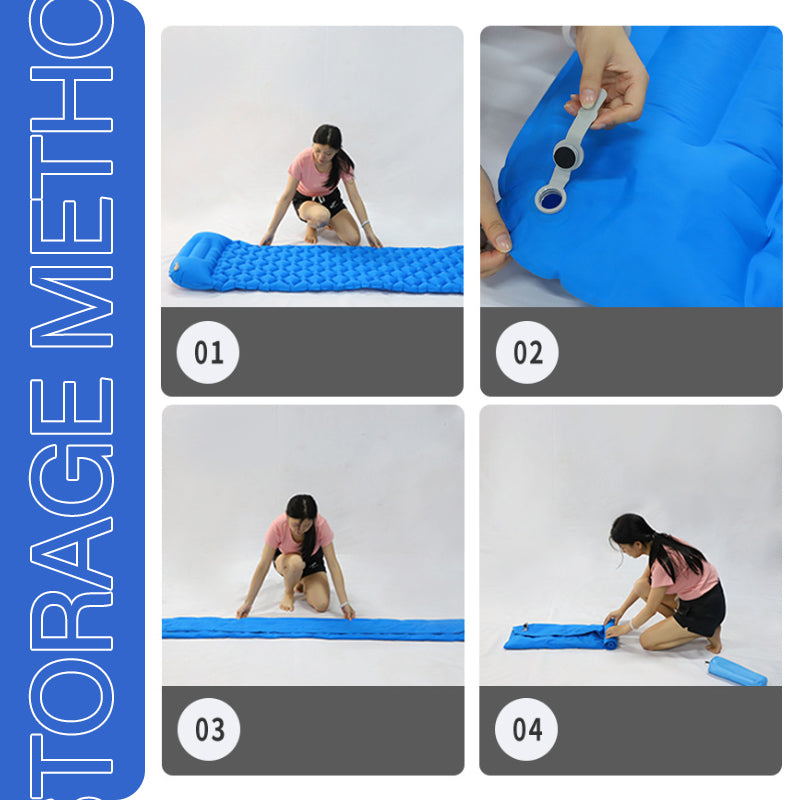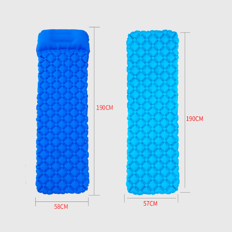 "Fuktsäker uppblåsbar campingmadrass med kudde, hållbart material, blå färg, robust och kompakt design för utomhusbruk."