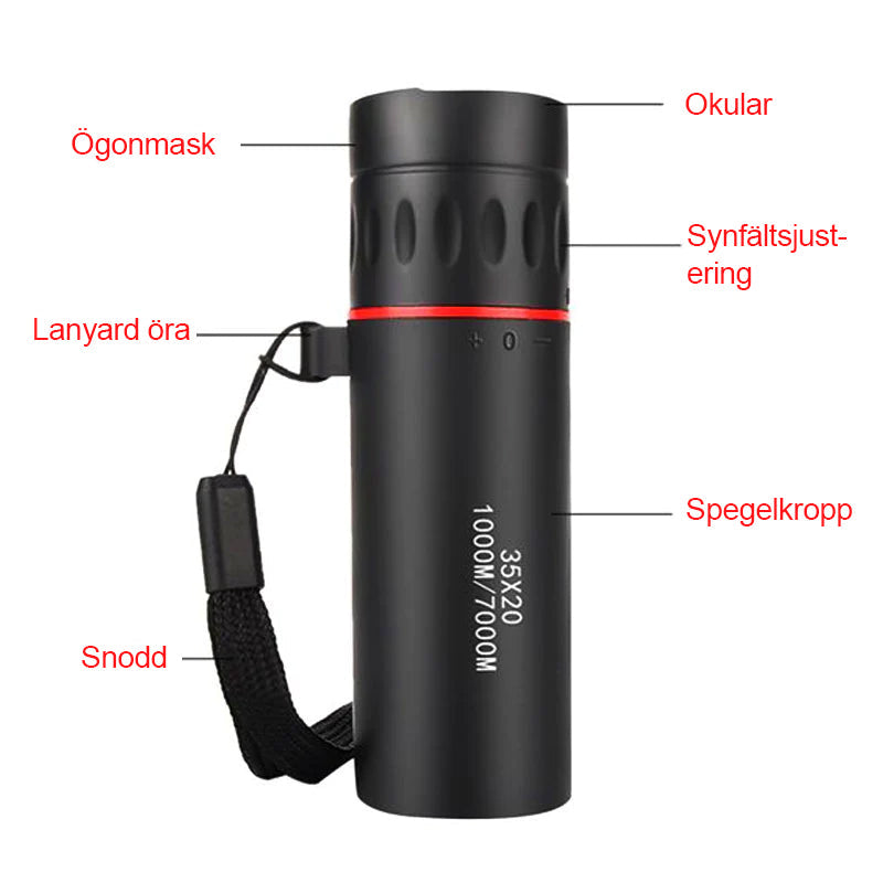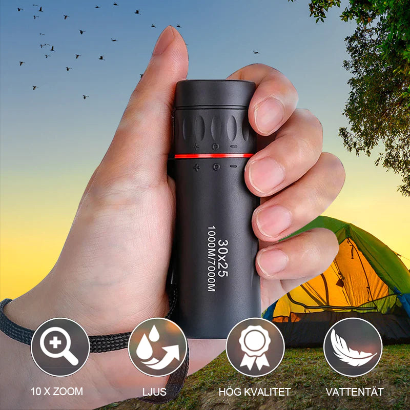 Upptäck världen omkring dig med detta kompakta och lätta mini fickteleskop. Perfekt för äventyrsentusiaster som gillar fågelskådning, jakt eller sightseeing. Få en kristallklar bild med hög effektförstoring tack vare de högkvalitativa lasermaskinerade linserna.