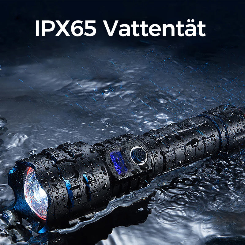 "Uppladdningsbar stark LED-ficklampa för utomhusbruk, robust och vattentät IP-X65 med justerbara ljuslägen."