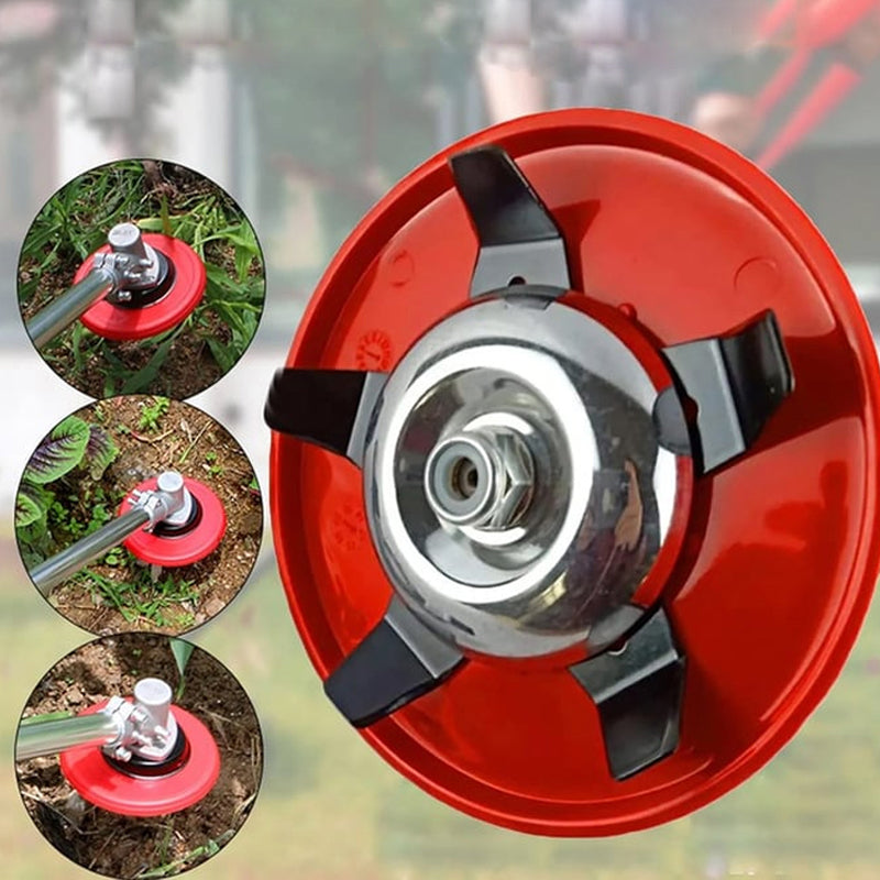 Röd multifunktionell ogrässkiva i stål och plast för trädgårdsarbete, med stjärnformat blad på grön bakgrund.