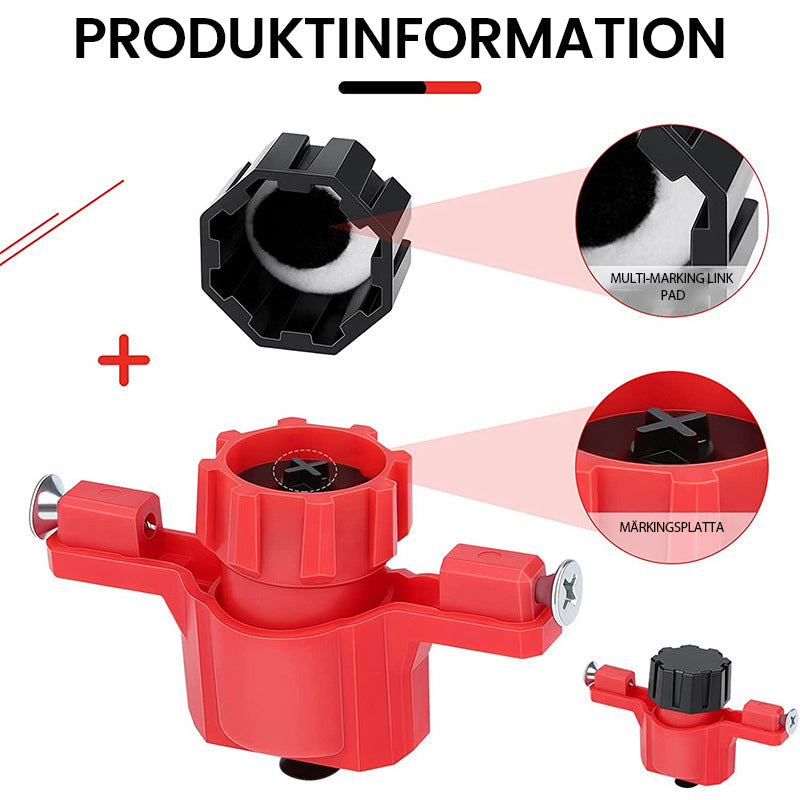 "Nyckelhålsmärkningsverktyg för exakt montering, blått och grått, visas med mätmarkeringar mot vit bakgrund."