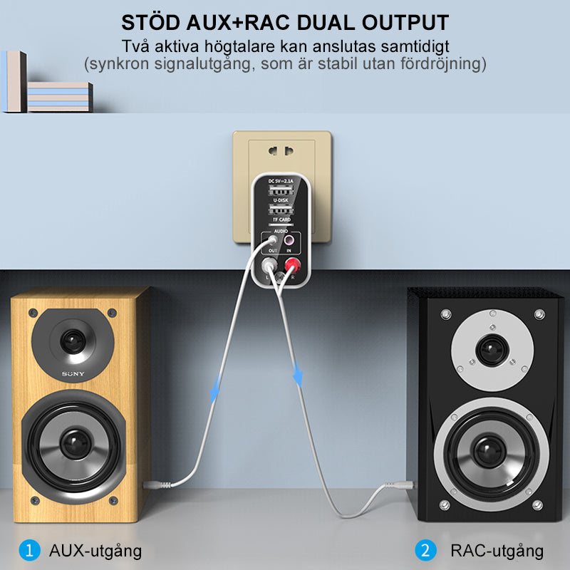 • AUX och RCA dubbla utgångar möjliggör anslutning till äldre högtalare utan problem.