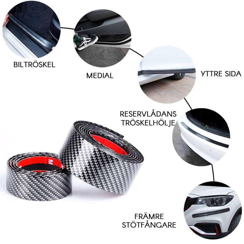"Kolfiber svart tröskeltejp för bil skyddar och stilsätter bilens trösklar, elegant design med slitageskydd."